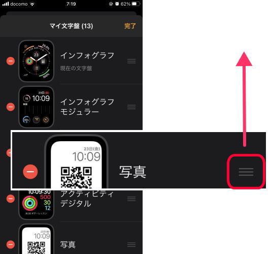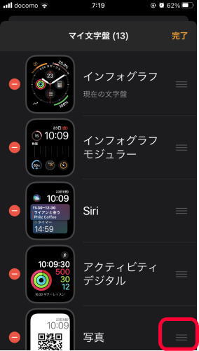 マイ文字盤の一覧が表示されるので、普段使っている文字盤のすぐ下に配置順を入れ替えます。